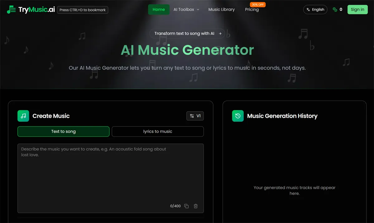 Sign up at Trymusic.ai with Google - get 6 free credits instantly!